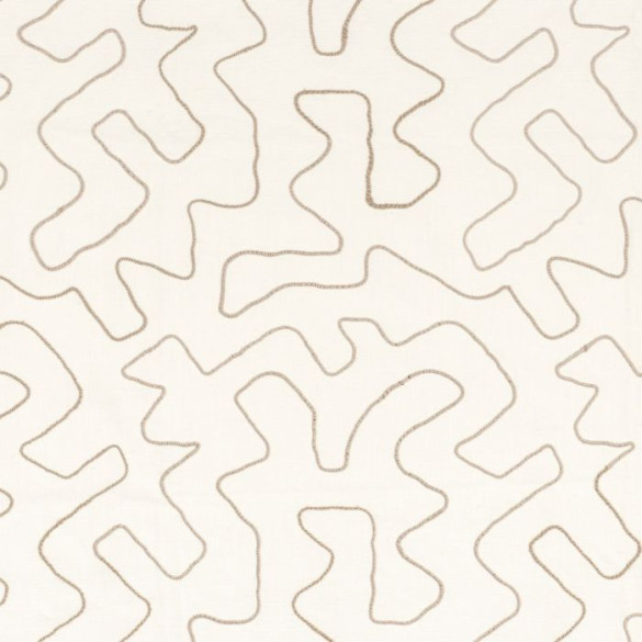 Le tissu Périple est une création majeure de la collection Viaggio. Il se distingue par un travail de broderie innovant utilisant un fil guipé pour tracer un chemin sinueux sur une trame de fond. Ce procédé crée un effet de corde appliquée saisissant, donnant au motif l'impression de se détacher de la matière grâce à un bel relief 3D.