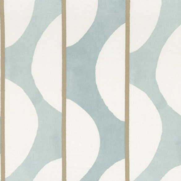 Le tissu Viaggio est la pièce maîtresse de la collection du même nom. Il se définit par un motif imprimé, puis brodé d’une rayure réalisée avec un savant mélange de fils de coton et de viscose. Ce travail de broderie apporte au tissu un joli volume et un relief remarquable, rehaussé par une très légère touche satinée qui capte subtilement la lumière.