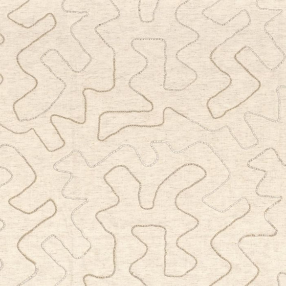 Le tissu Périple est une création majeure de la collection Viaggio. Il se distingue par un travail de broderie innovant utilisant un fil guipé pour tracer un chemin sinueux sur une trame de fond. Ce procédé crée un effet de corde appliquée saisissant, donnant au motif l'impression de se détacher de la matière grâce à un bel relief 3D.