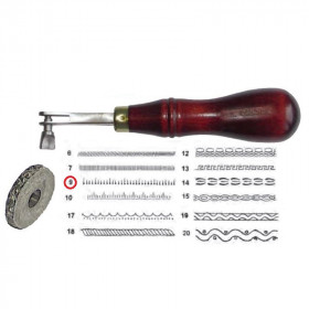 La roulette d'embossage permet de graver de jolis motifs sur vos ceintures, lanières, porte-monnaie ou pièces de cuir. Elle s'utilise sur du cuir tannage végétal humidifié au préalable, qui sera éventuellement teint par la suite. Son usage est simple et il existe de nombreux motifs à imprimer pour décorer vos créations cuir. Elle se monte sur l'axe d'un manche en bois ergonomique, comme la griffe à molette pour repérer les trous de couture.